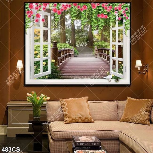 Tranh 3D cửa sổ và hoa bên cây cầu gỗ chất lượng cao