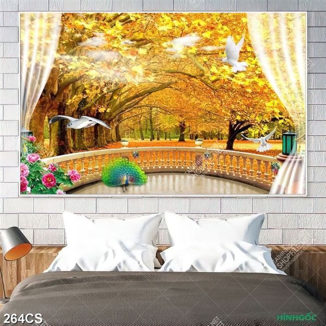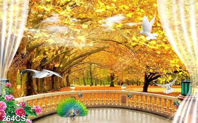 Tranh ban công bên cây lá vàng mùa thu đẹp in kính