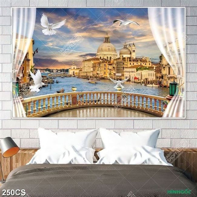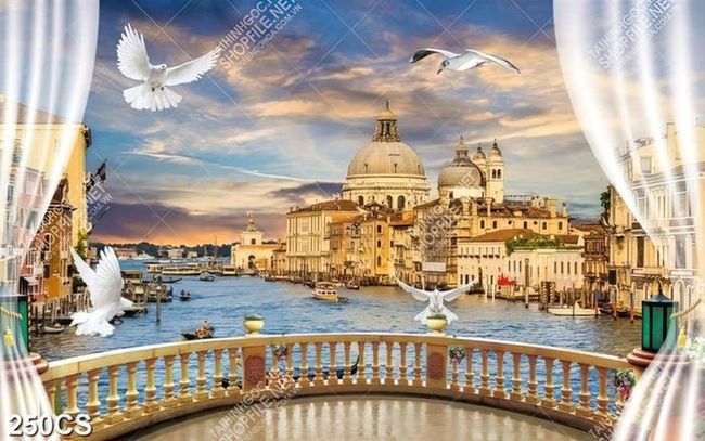 Tranh ban công hướng ra tòa lâu đài trên biển trang trí phòng khách
