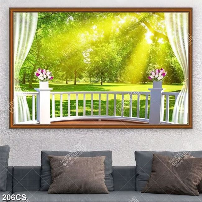 Tranh ban công nhìn ra khu vườn nắng ấm in kính