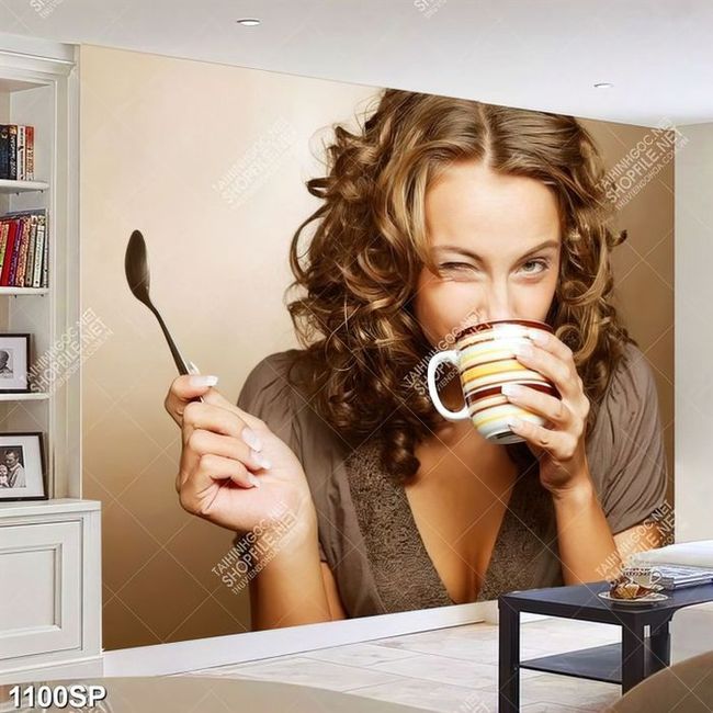 Tranh cô gái tóc xoăn thưởng thức café trong spa