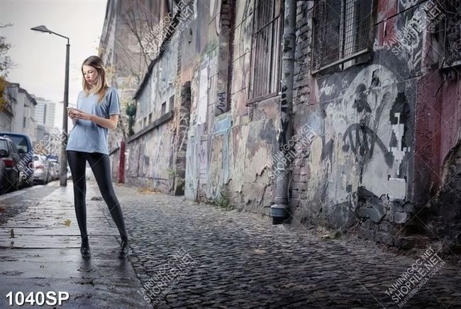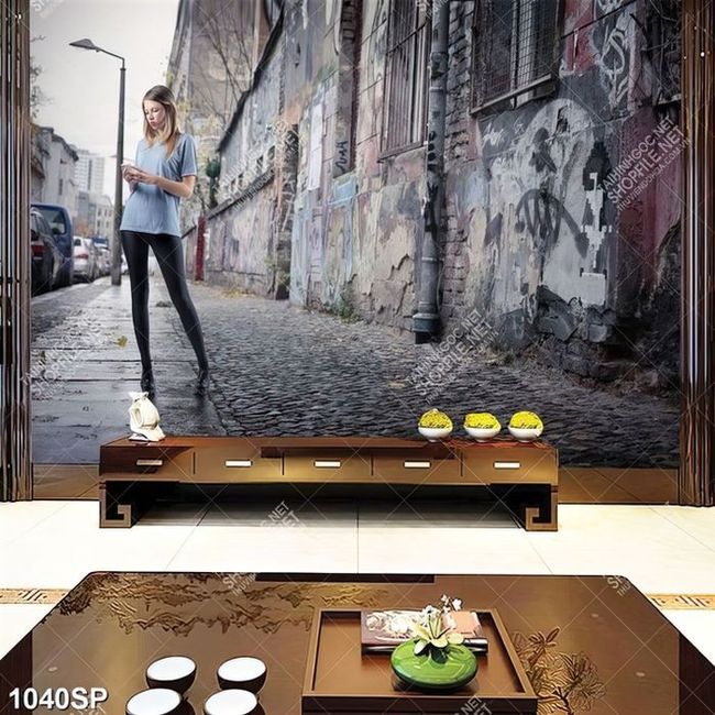 Tranh cô gái trẻ đứng bấm điện thoại bên đường phố