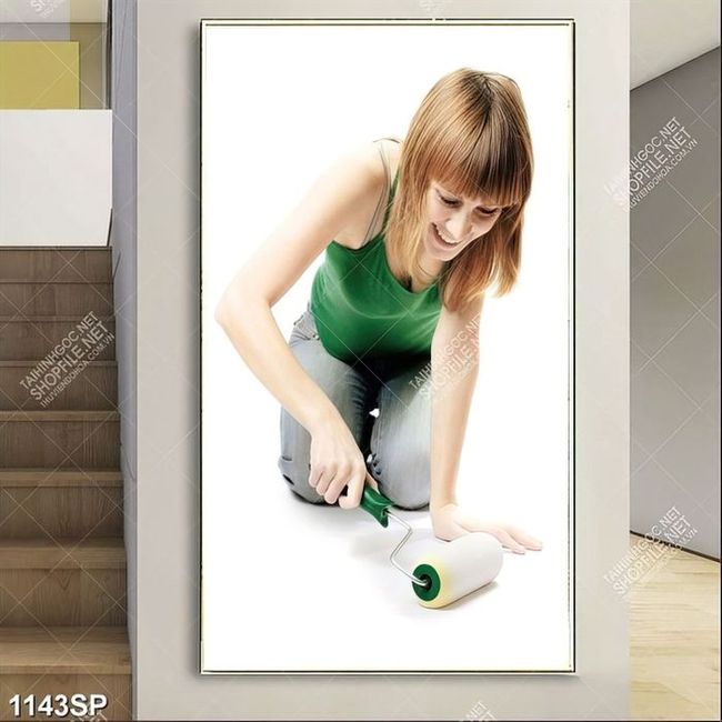 Tranh cô gái trẻ với chiếc lăn sơn trên sàn