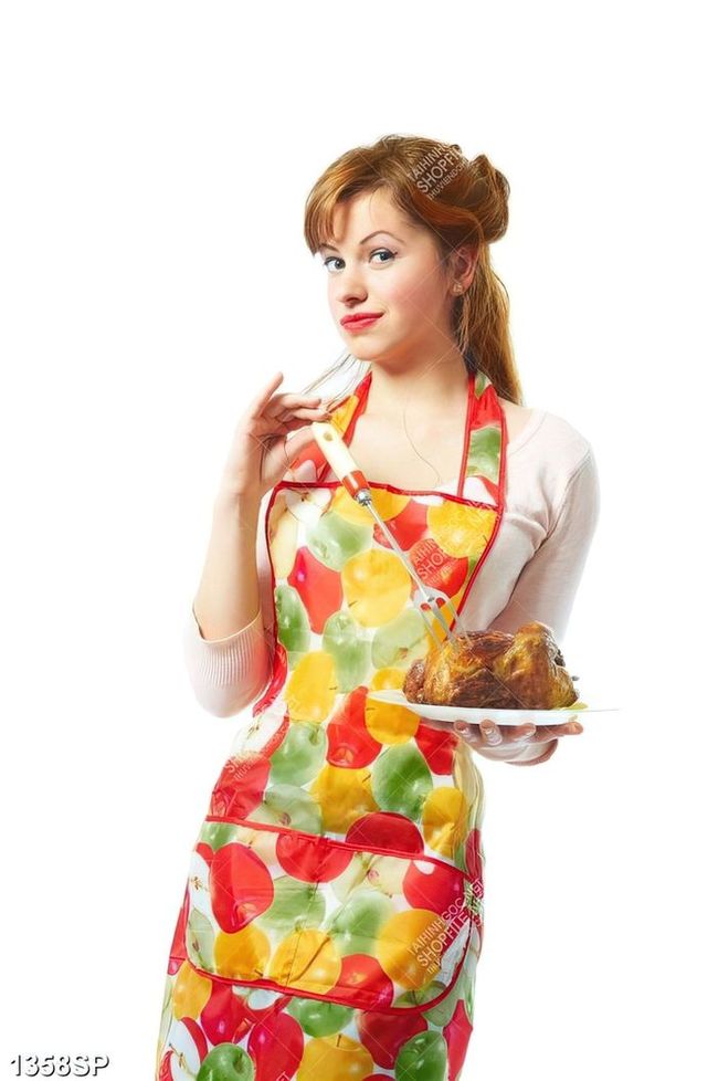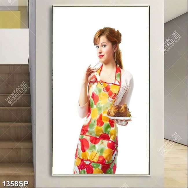 Tranh cô gái trẻ với đĩa gà nướng hấp dẫn trên tay