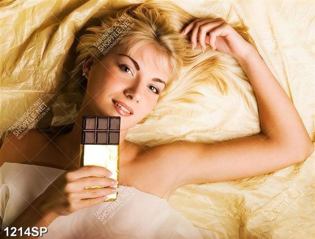 Tranh cô gái xinh đẹp cầm thanh socola nằm trên giường ngủ