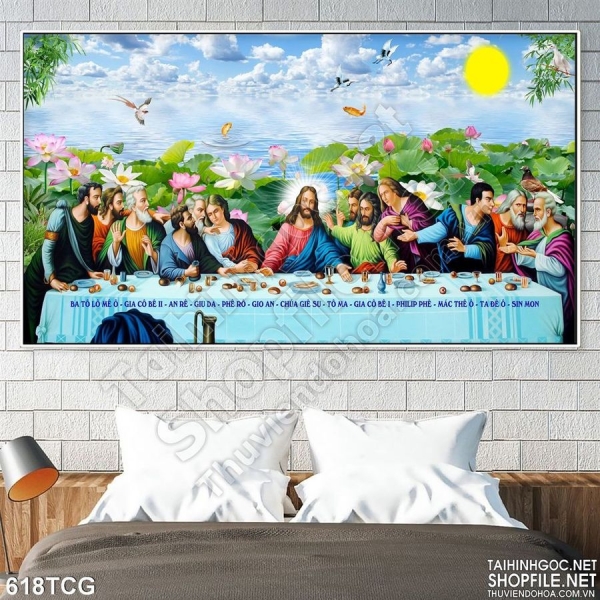 Tranh công giáo bữa tiệc ly và hoa sen in decal
