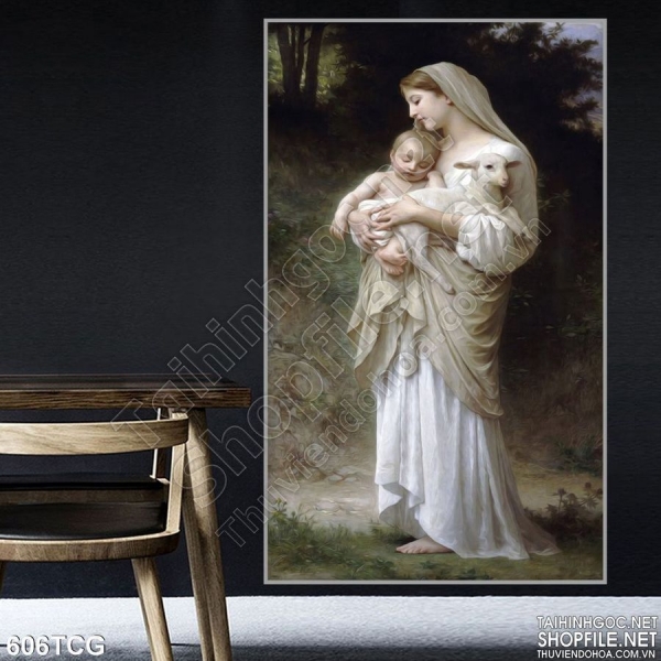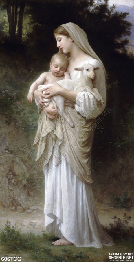 Tranh công giáo Mẹ maria và Chúa hài nhi và con chiên