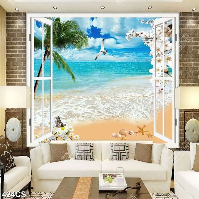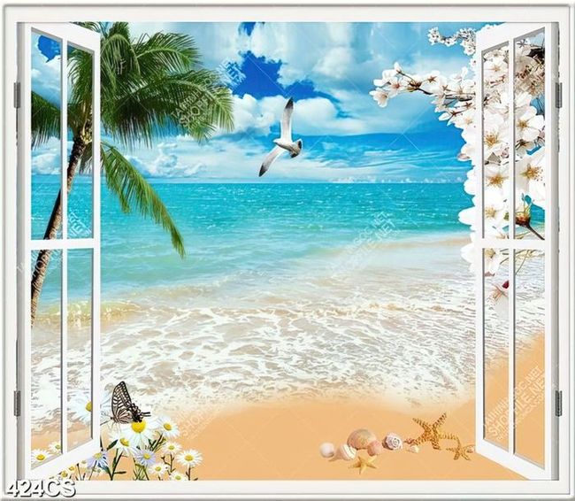 Tranh cửa sổ bên bãi cát vàng dán tường in kính