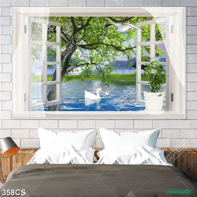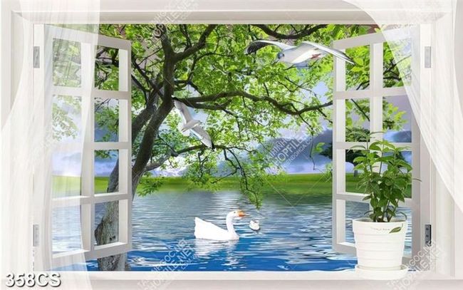 Tranh cửa sổ bên hồ nước và thiên nga trắng đẹp in kính