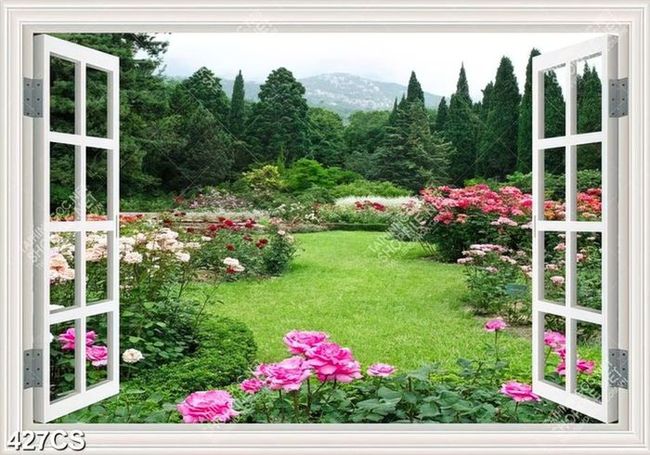 Tranh cửa sổ bên vườn hoa nở rộ file gốc