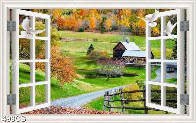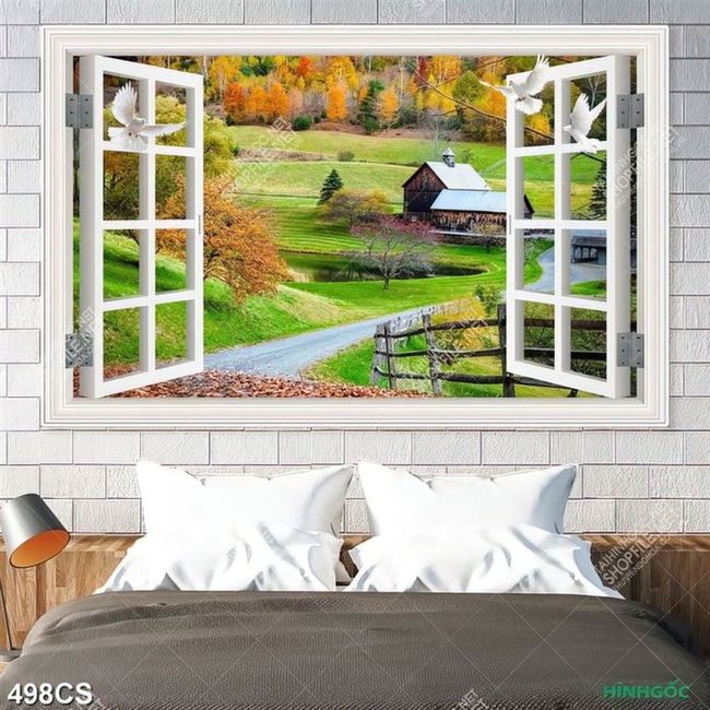 Tranh cửa sổ hướng ra ngôi nhà trên đồng cỏ xanh
