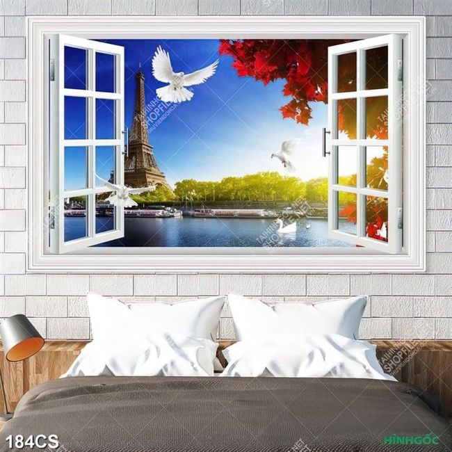 Tranh cửa sổ hướng ra tháp Eiffel bên dòng sông in kính