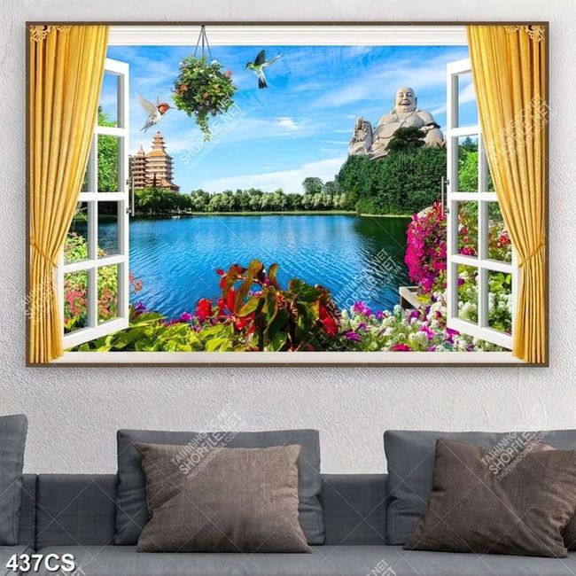 Tranh cửa sổ hướng ra tượng Phật bên dòng sông trang trí nội thất