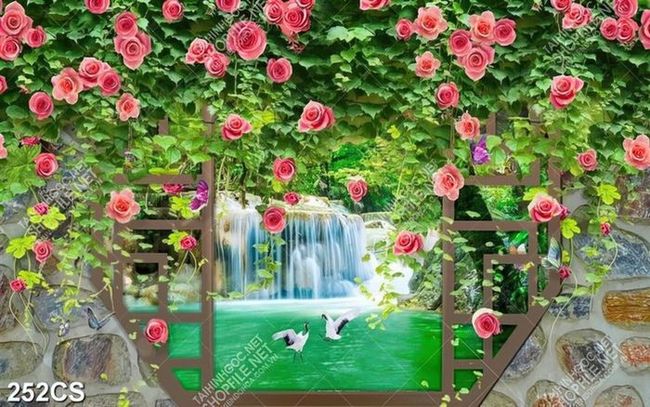 Tranh cửa sổ phủ dàn hoa hồng leo bên thác nước đẹp nhất in kính