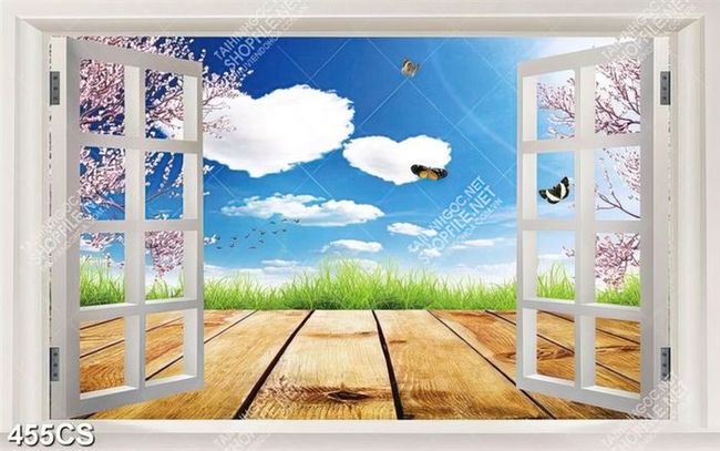 Tranh cửa sổ và bầu trời xanh decor phòng khách