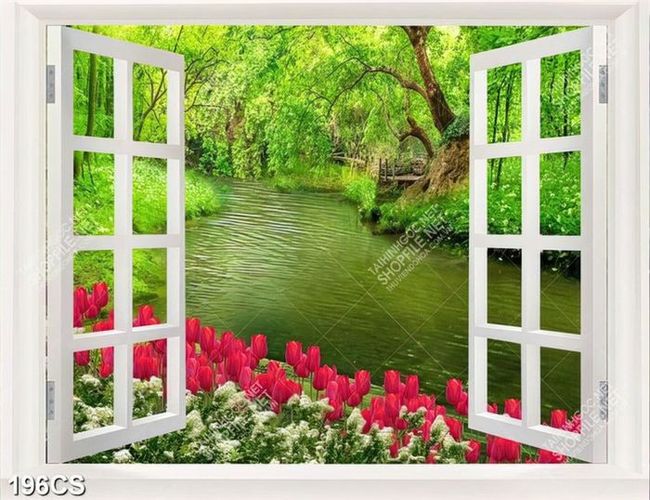 Tranh cửa sổ và hoa tulip bên dòng sông xanh