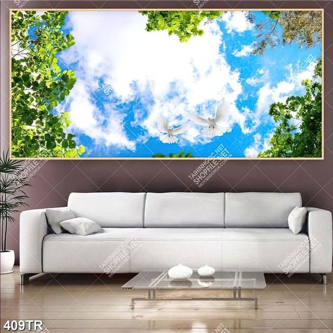Tranh dán trần in uv bầu trời mây trắng và tán cây xanh