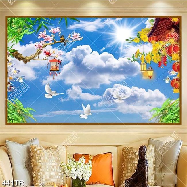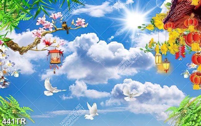 Tranh dán trần nghệ thuật hoa bầu trời hoa mai hoa đào file gốc