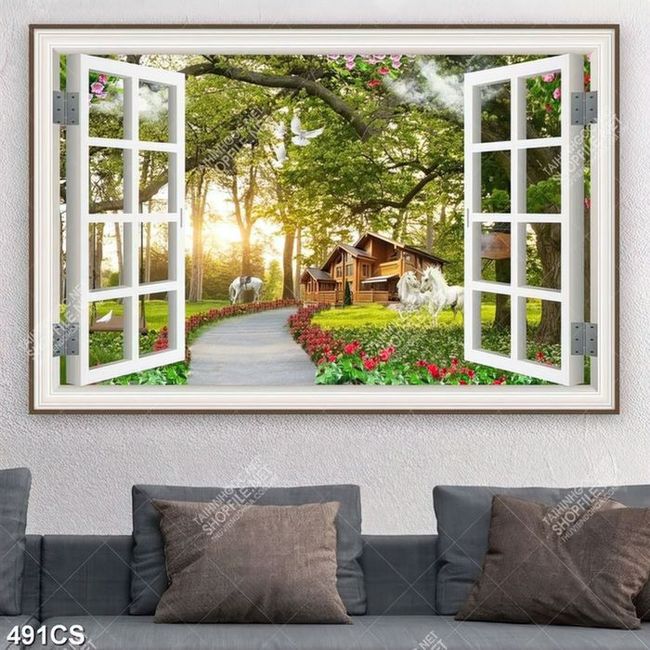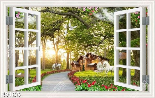 Tranh dán tường cửa sổ nhìn ra ngôi nhà gỗ và hoa