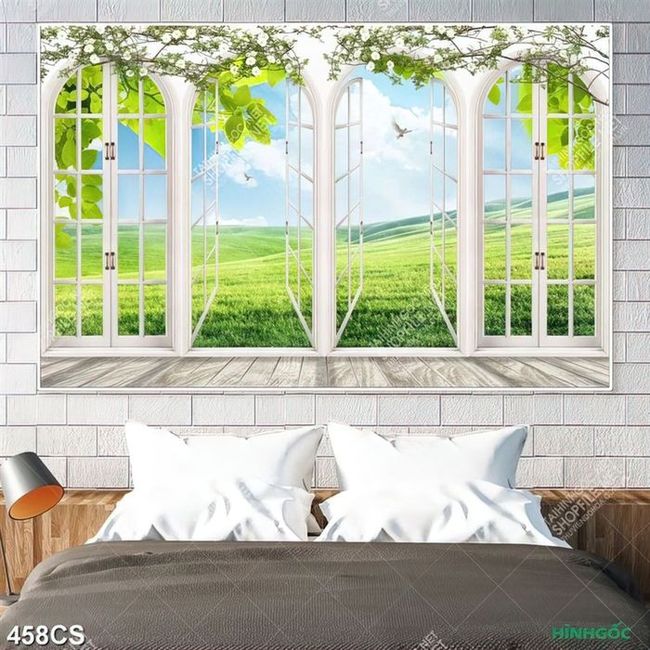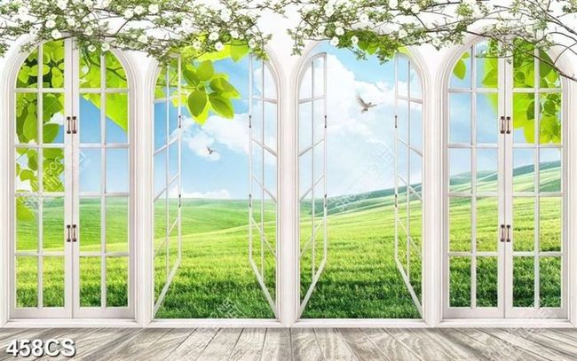 Tranh dán tường khung cửa bên cánh đồng cỏ xanh in uv