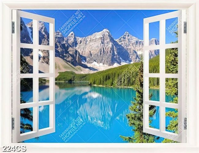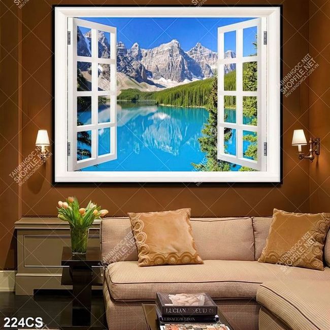 Tranh decor tường cửa sổ bên núi rừng in uv