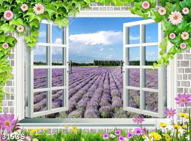 Tranh decor tường khung cửa sổ bên vườn hoa oải hương file gốc