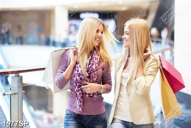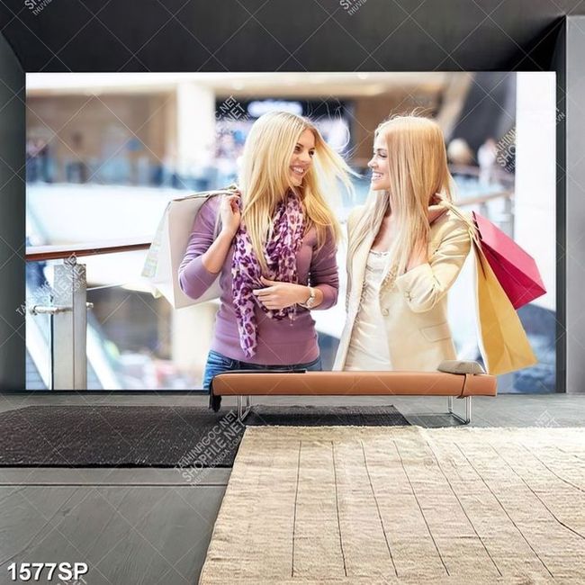Tranh hai cô gái xinh đẹp đi dạo trung tâm mua sắm
