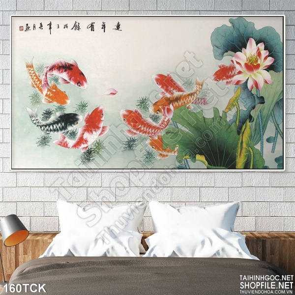 Tranh hoa sen, cá chép tthư pháp nghệ thuật