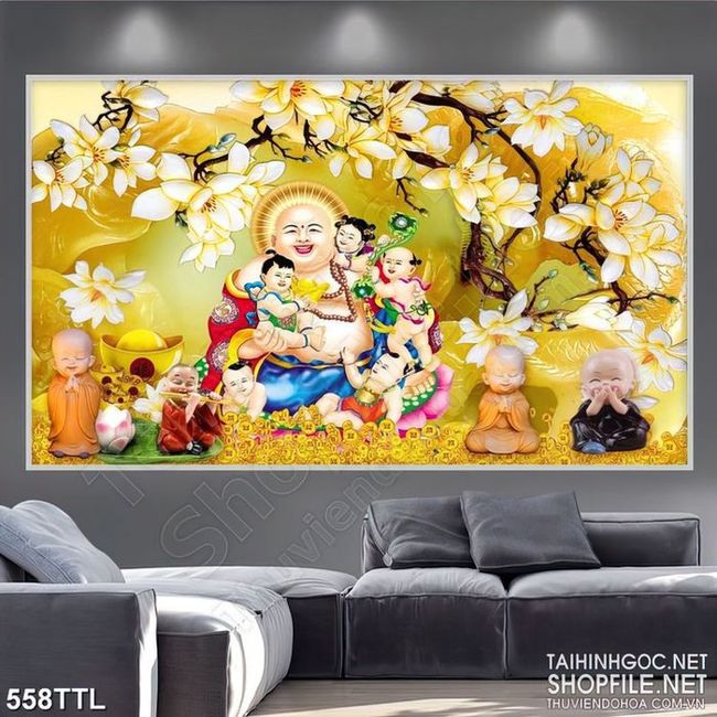 Tranh in treo tết Phật Di Lặc bên rừng mai vàng