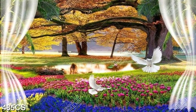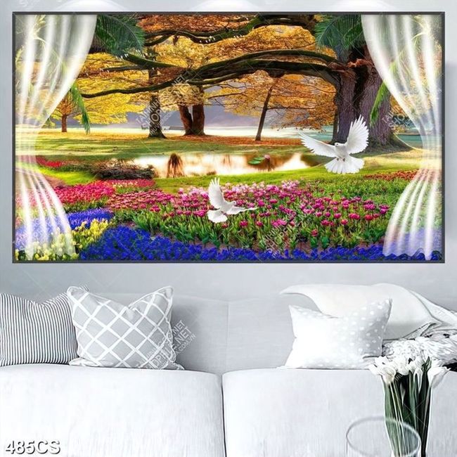 Tranh khung cửa sổ bên vườn hoa và cây lá vàng chất lượng cao