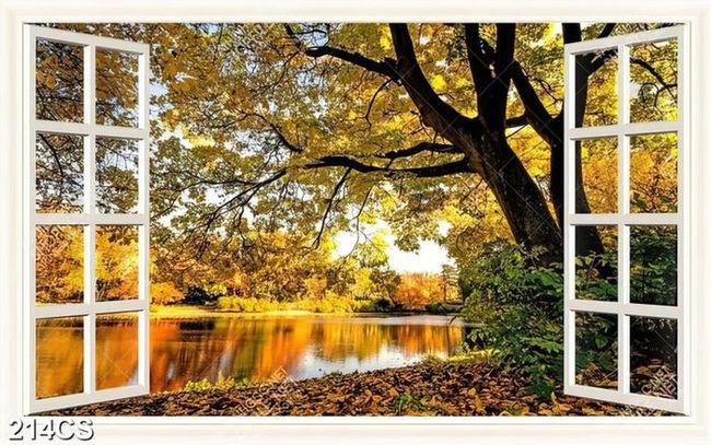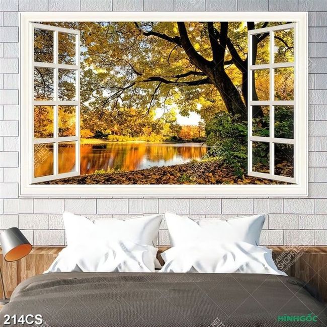 Tranh khung cửa và cây lá vàng mùa thu đẹp nghệ thuật