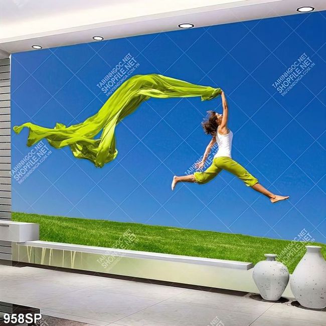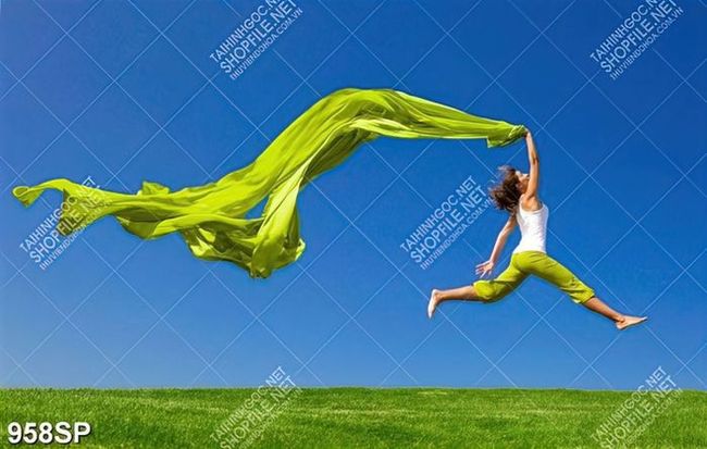 Tranh nghệ thuật cô gái tung bay cùng tấm lụa xanh treo spa