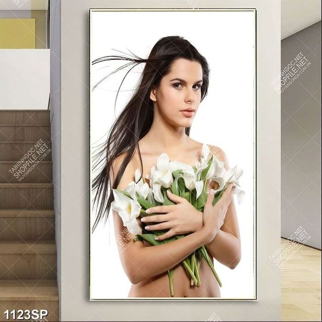 Tranh người mẫu tạo dáng với hoa ly trắng treo spa