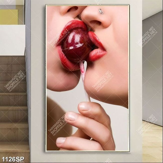 Tranh spa hai đôi môi đỏ ngậm kẹo ngọt ngào