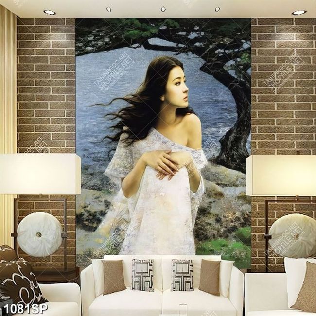Tranh spa thiếu nữ xinh đẹp đứng bên sông