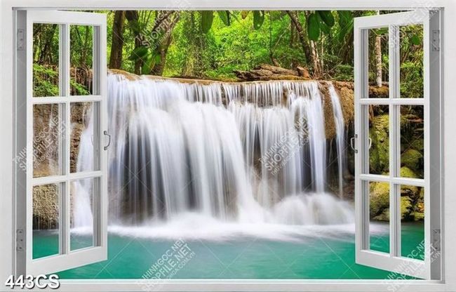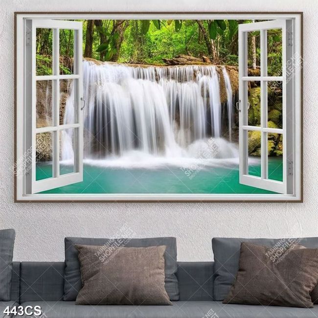 Tranh thác nước hùng vĩ bên cửa sổ trang trí phòng khách