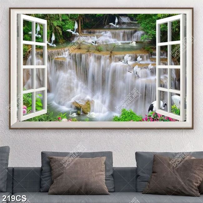 Tranh thác nước hùng vĩ bên ô cửa decor tường