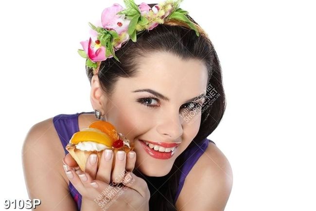 Tranh treo spa cô gái xinh đẹp nở nụ cười bên chiếc bánh trái cây