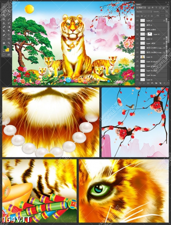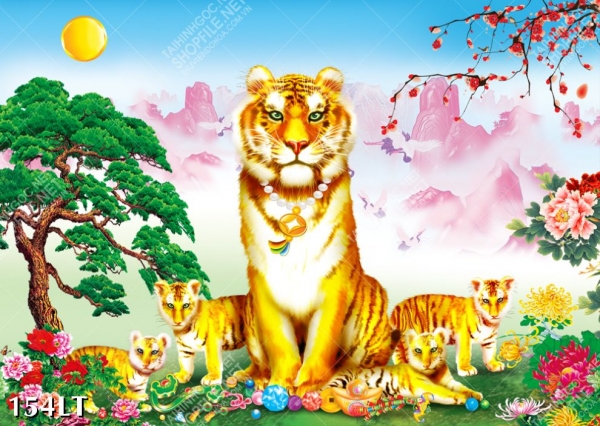 Tranh treo tường mẹ con nhà hổ vui mừng chào xuân năm mới, file gốc tranh hổ vàng chào năm mới nhâm dần 2022